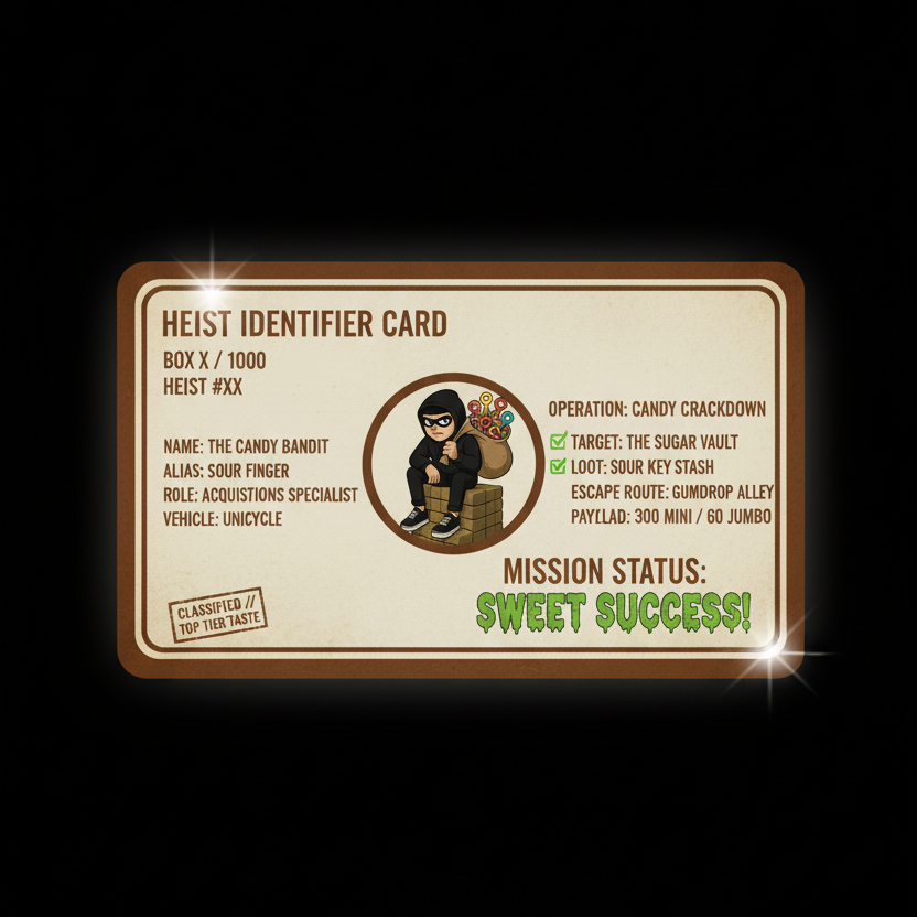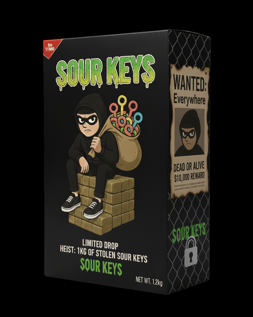 The Sour Key Bandit is a rogue importer of joy: delivering kilos of elite sour keys packed in a limited-run collector box, dropped in small heists - with no restocks.